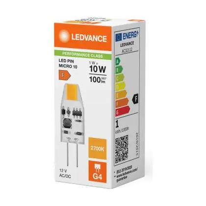 Beschrijving Ledvance LED Pin Micro 12V G4 Helder 1W 100lm - 827 Zeer Warm Wit | Vervangt 10W