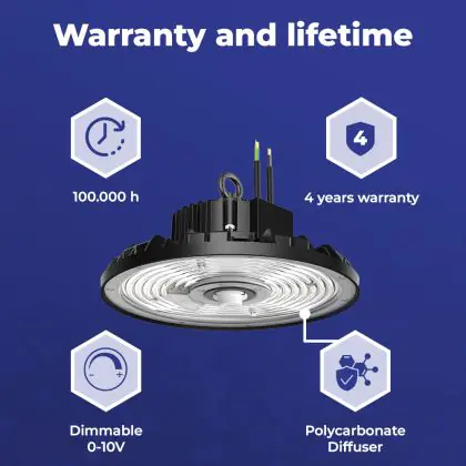 Deze LED High-bay bezit een enorme lichtopbrengst van 16000 lumen! Dit hoge aantal laat zien dat een armatuur zoals deze ook vanaf een grote hoogte nog steeds zijn werk doet. Hang je een High-bay armatuur zoals deze in een ruimte met lagere plafonds, dan is de hoeveelheid licht simpelweg te krachtig en te fel. Met als gevolg dat wanneer mensen in het licht kijken, ze direct worden verblind. Vanaf hoge plafonds (6 tot 14 meter) is dat een ander verhaal. Ook niet onbelangrijk om op te letten is de kleurtemperatuur. Deze is bij dit product: 4000K - Koel Wit. Twijfel je over de juiste kleurtemperatuur voor een grote oppervlakte? Kies dan voor koel wit (4000K). Deze lichtkleur heeft een natuurlijke tint en houdt werknemers in productie-omgevingen alert.