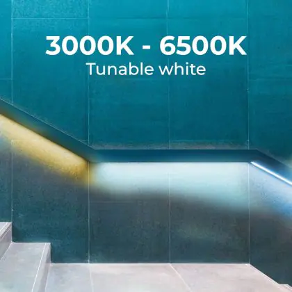 Met deze LED strip kun je iedere ruimte voorzien van het juiste licht. Deze lichtbron kan namelijk ook in hoeken worden geplaatst door het flexibele design van de strip én kan worden ingekort op de aangegeven kniplijnen. Bovendien heb je keuze uit diverse lichtkleuren, die LED strips geschikt maken voor zowel woningen als bedrijven. Hoewel het gebruik van gekleurde LED strips vooral met persoonlijke smaak te maken heeft, worden witte lichttinten specifiek gebruikt voor een bepaald doel. Deze LED strip heeft de lichtkleur 3000K - 6500K Afstembaar Wit. Hier lees je waar welke lichtkleur het best tot zijn recht komt.
