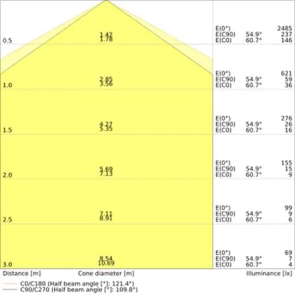 De lichtopbrengst (Lumen), geeft weer hoe krachtig het uitgestraalde licht is. Dit is belangrijk om te weten om de juiste sfeer te creëren. 0 tot 400 Lumen is bij uitstek geschikt voor accent- of sfeerverlichting. Een hoger aantal Lumen is, afhankelijk van de grootte van de ruimte, beter geschikt als ondersteunende- of basisverlichting. Heb je plafonds hoger dan 4 meter, dan is een lichtopbrengst van minimaal 8000lm aan te raden indien heldere verliching gewenst is (vb. in werkomgevingen).